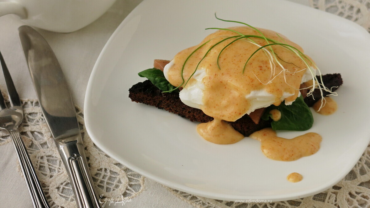 Яйцо пашот с лососем и сырным соусом