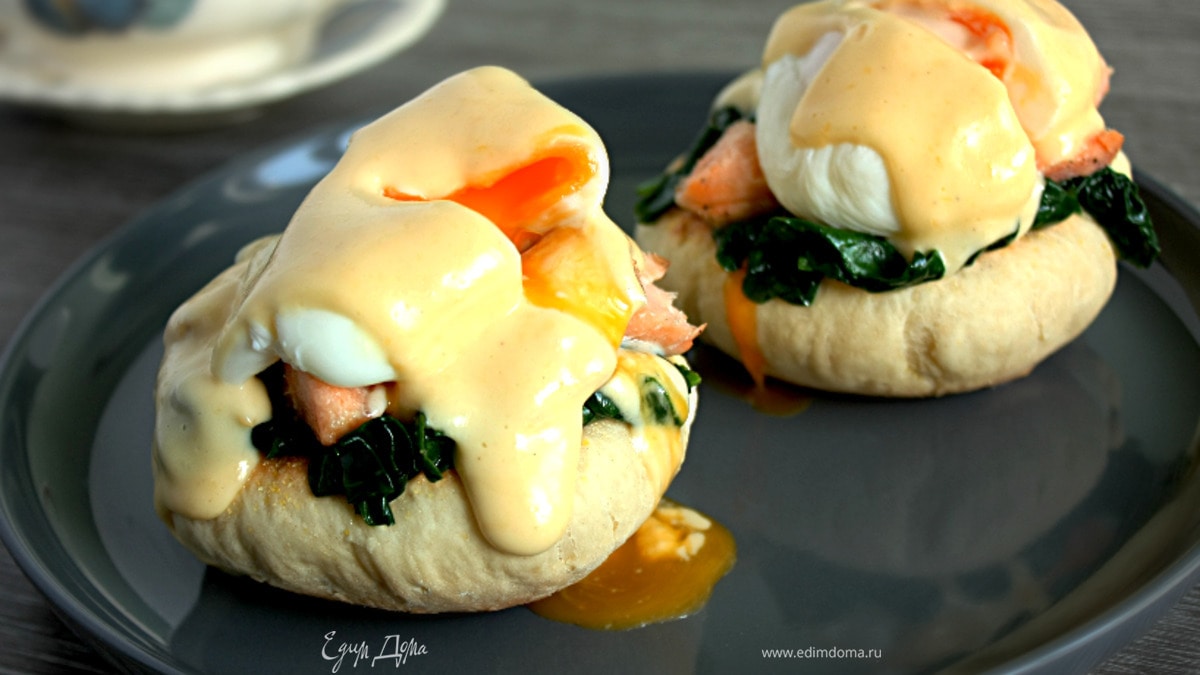 Завтрак выходного дня. Оригинальное название очень длинное: «Английские маффины с копченым лососем, шпинатом, яйцами пашот и голландским соусом», поэтому я его сократила. Причем лосось