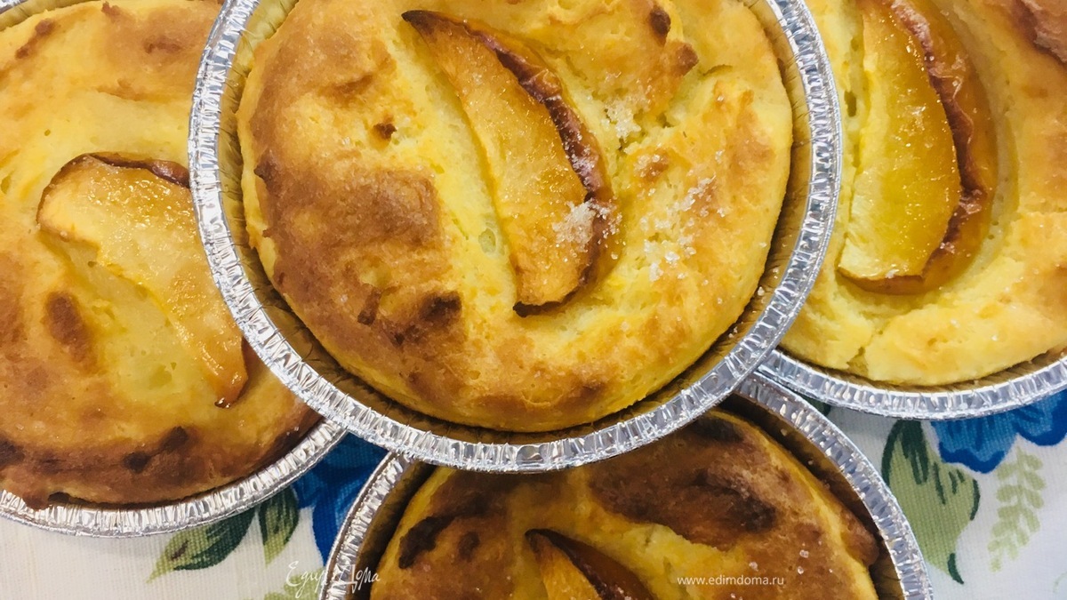 Форму для запекания смазать сливочным маслом. Выложить массу, заполнив на 1/3 форму, украсить яблоком, сверху посыпать сахарным песком. Выпекать на 170°С 30 минут + 150°С 20 минут.