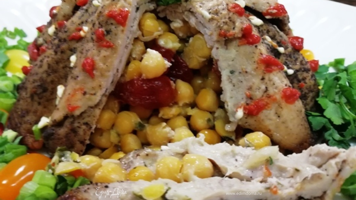 Выкладываем на свинину начинку из нута.