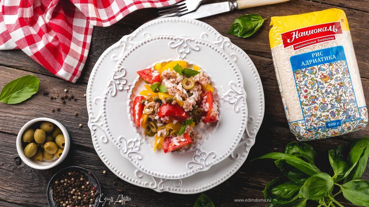 Соедините в салатнике рис, помидоры, перец и оливки. Добавьте тунца.