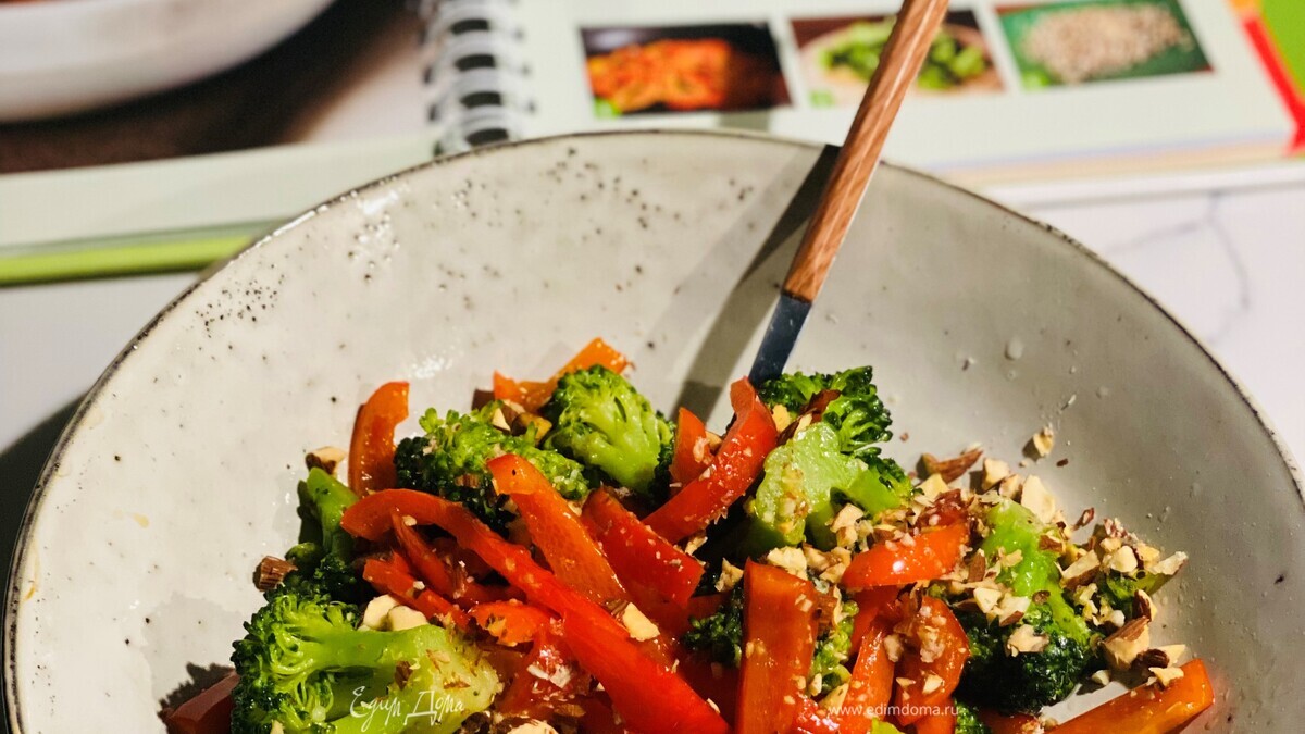 В салатник выложить брокколи, перец, посыпать измельченным миндалем, добавить лимонный сок, соль. Все перемешать.