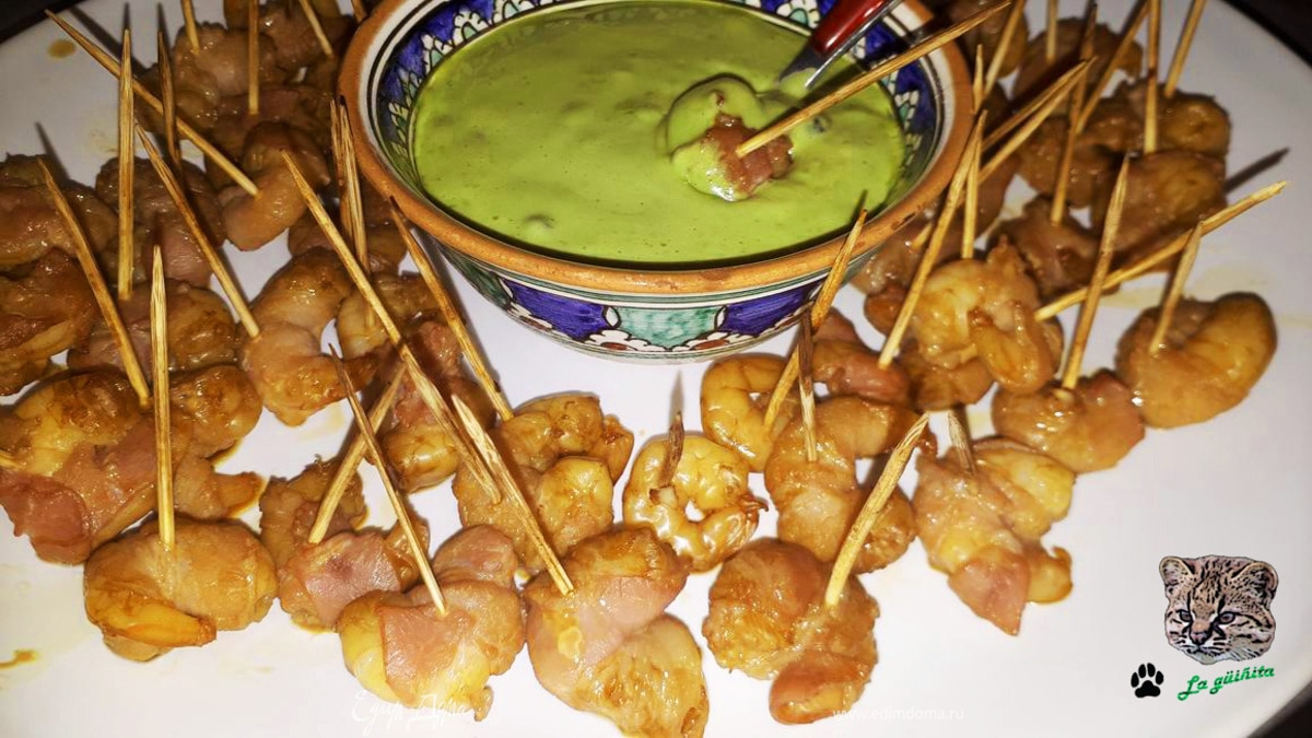 Разрежьте нарезку бекона на 2–3 части. Оберните кусочек бекона вокруг креветки, зафиксируйте зубочисткой и выложите на противень. Выпекайте в разогретой до 200°C духовке в режиме «Гриль» 8–10 минут.