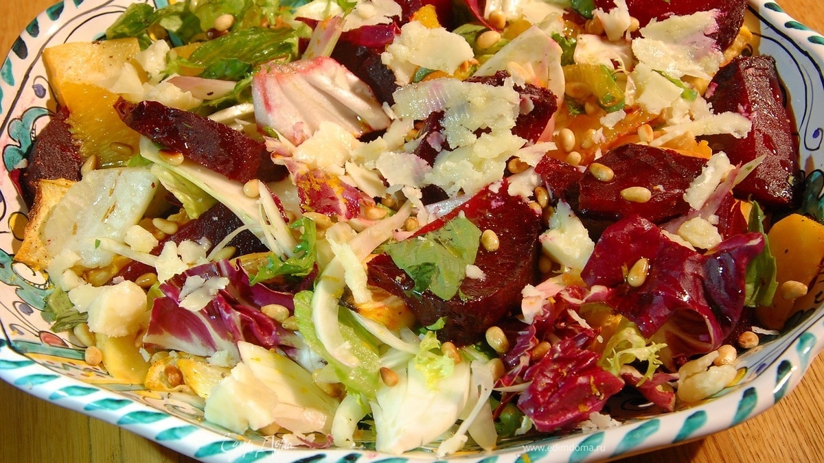 Салат из запеченной репы и свеклы с апельсином, фенхелем и кедровыми орехами