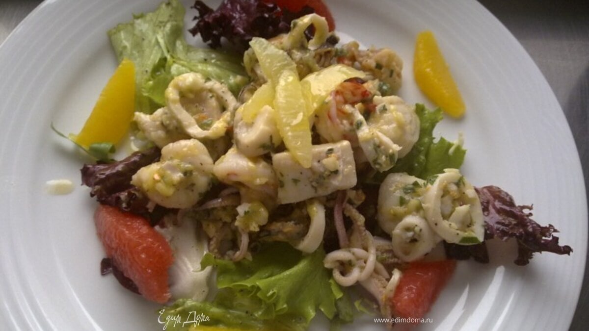 Готовые морепродукты замариновать в лимонном соусе с добавлением соли, перца, орегано, чеснока и петрушки.