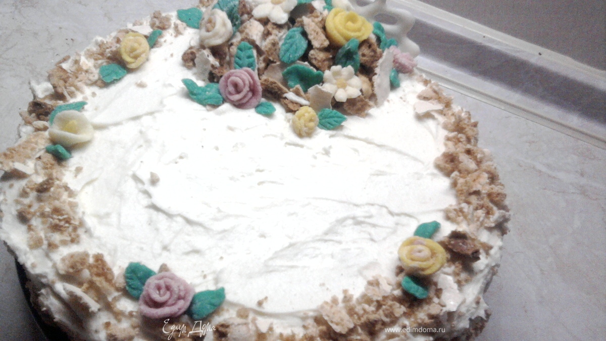 Как и собиралась (после пирожных) испекла торт по рецепту "Киевского", но так как я впервые попробовала поработать с мастикой, а выравнивая коржи, заметила,что обрезки больше похожи на "обломки", то и решила украсить тортик в виде альпийской горки. Понимаю, что на настоящей горке розы не растут, но пофантазировала...