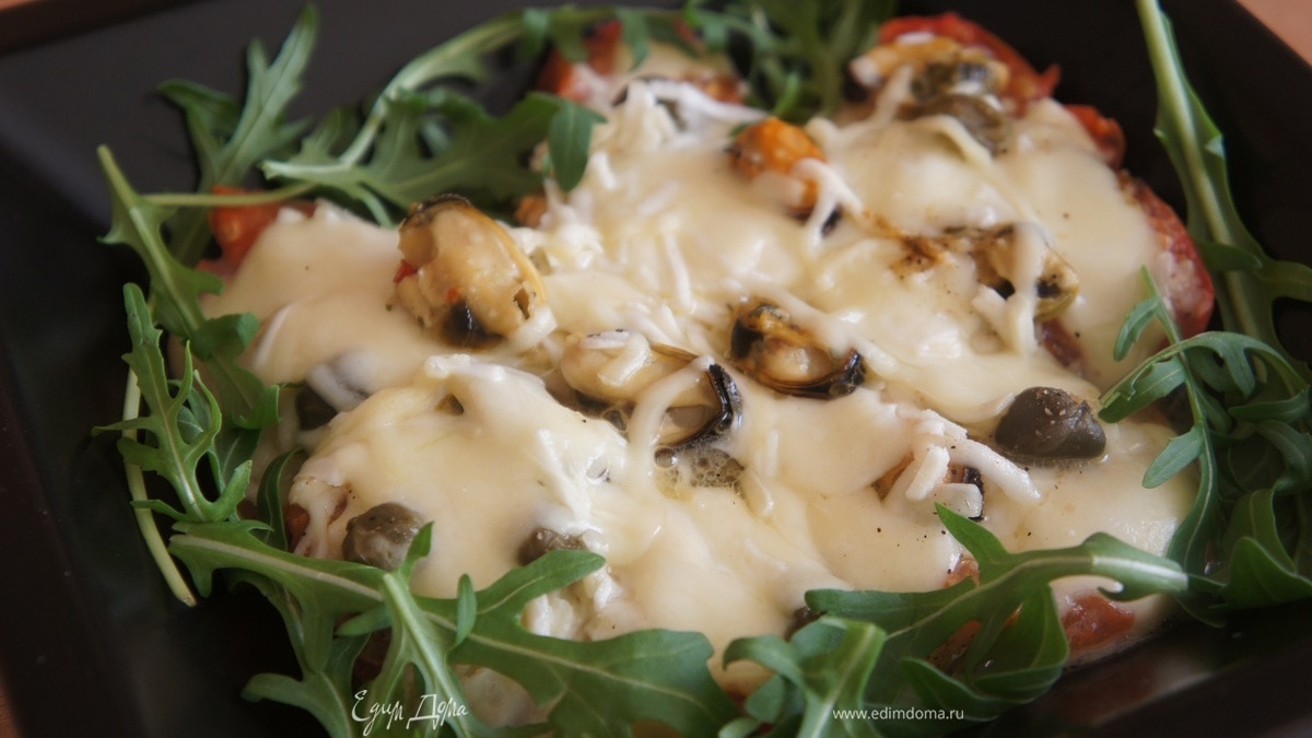 Запеченный помидор с мидиями, сырами, каперсами