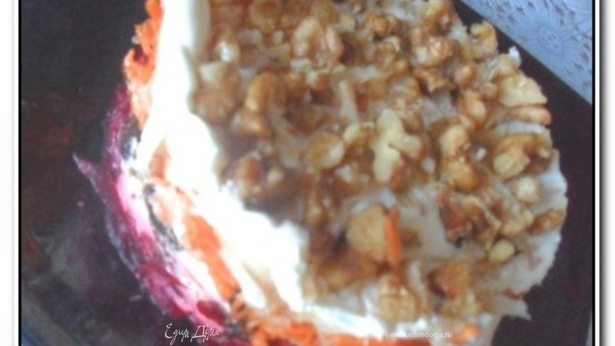 Чернослив залить кипятком, обсушить и мелко нарезать. Свеклу отварить до готовности. Очищенную свеклу, морковь, яблоки натереть на средней терке. У натертых яблок отжать сок. Выложить продукты слоями на большую плоскую тарелку в следующей последовательности: - свекла - пропущенный через пресс сечнок с майонезом - измельченный чернослив - смесь сметаны с майонезом - грецкие орехи - морковь - яблоки (без сока) - смесь сметаны с майонезом - грецкие орехи Можно сверху посыпать зеленью. Слои можно чередовать несколько раз: это зависит от исходного количества продуктов и желаемой высоты торта. Мне хватило сделать и по одному разу. Поставить в холодильник на 3-4 часа.