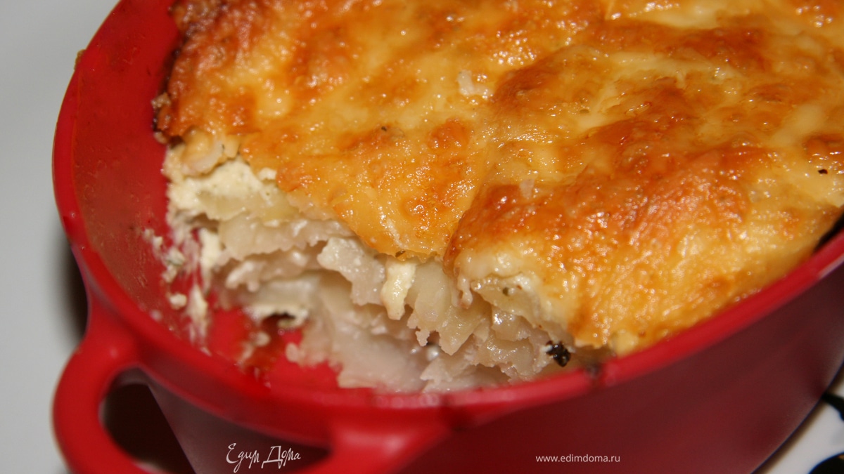 На дно силиконовой формы выкладываем слоями картофель, заливаем сливками. Отправляем в разогретую до 120 гр духовку, примерно минут на 30-40.