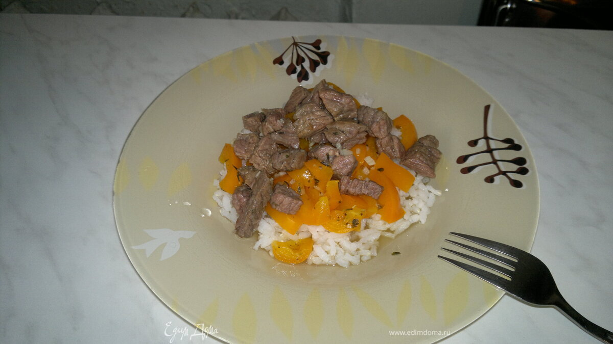 Говядина тушеная с цедрой лимона и чесноком, белый пресный рис с перецем