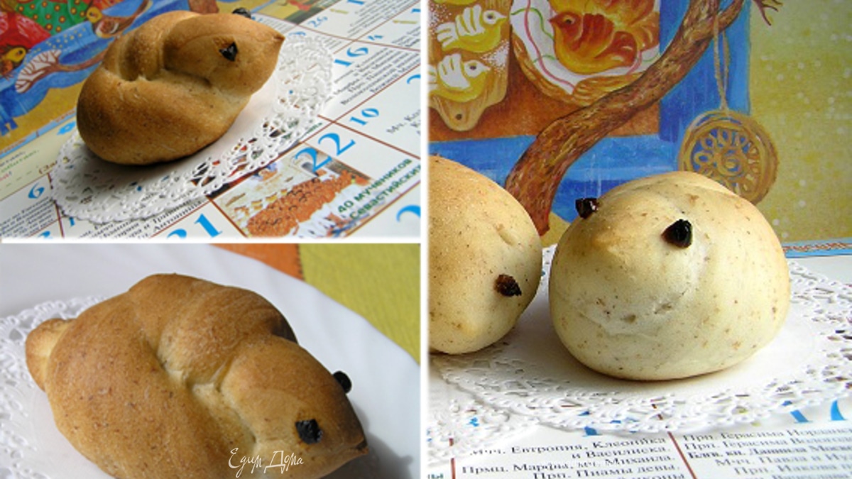 завязать узлом. Из верхнего конца сделать "головку с клювом", из нижнего "хвостик",сделав насечки с помощью тупой стороны ножа. Сделать "глазки" из изюма. Оставить на 30-40 минут в теплом месте, накрыв полотенцем.
