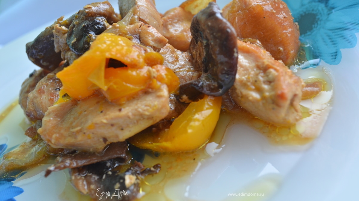Приготовление: Куриное мясо порезать на небольшие брусочки и обжарить на оливковом масле. Лук и перец разрезать на четвертинки, грибы на пластины. Добавить к мясу и обжарить. Посолить, поперчить и залить стаканом горячей воды, тушить на маленьком огне до готовности перца. МИР ВАМ!
