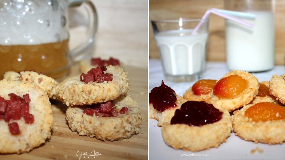 С тестом для сладких печений проделать все те же операции,только обвалять их в миндале.В углубление можно положить кусочки мармелада,хорошо вымоченные сухофрукты или ягоды из варенья.Можно оставить углубление пустым,а заполнить его джемом или густым пудингом после остывания.