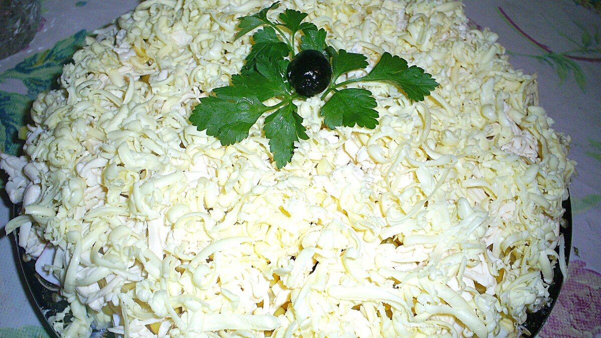 Последний слой - натертое на крупную терку сливочное масло. Его мы тоже заранее кладем в морозилку, чтоб оно затвердело. Вкусное сливочное масло в сочетании с сыром придают особую пикантность салату и необычный вкус. Кроме того под маслом сыр не обветрится и не засохнет.