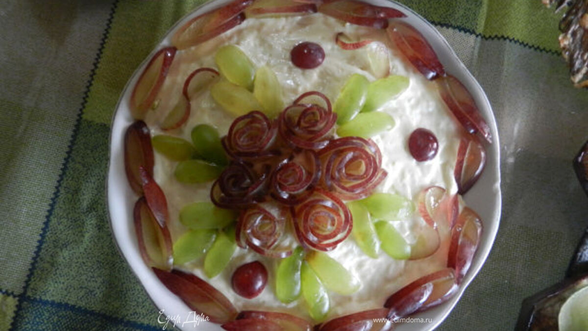 Курицу режем кубиком, виноград тоже (оставьте немного винограда для украшения).