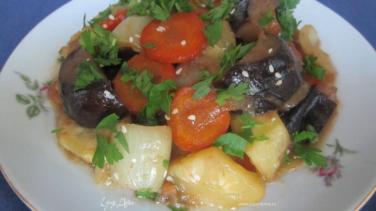 Баклажан нарезать кусочками, морковь - кольцами. Обжарить на растительном масле 8 минут.