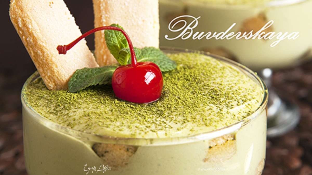 Затем опять выложите слой крема и повторите всё в той же последовательности, последним должен быть слой крема. Поместите десерт в холодильник минимум на 4-6 часов (лучше на ночь). Перед подачей посыпьте десерт порошком чая Матча через мелкое ситечко и украсьте листиками мяты, коктейльной вишни и печеньем савоярди, разрезанным на 2 половинки. ENJOY !