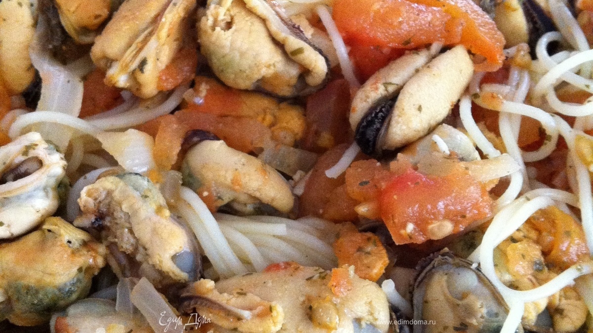 Выкладываем на блюдо спагетти, сверху мидии и подаем. Приятного аппетита!