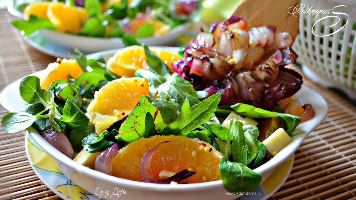 Для заправки в небольшой миске смешать горчицу, мёд, соль, чёрный перец, уксус и оливковое масло (для усиления цитрусового вкуса я использовала оливковое масло с добавлением апельсина), посолить, поперчить. Салат заправить горчично-медовой смесью и подавать к столу. Приятного аппетита!