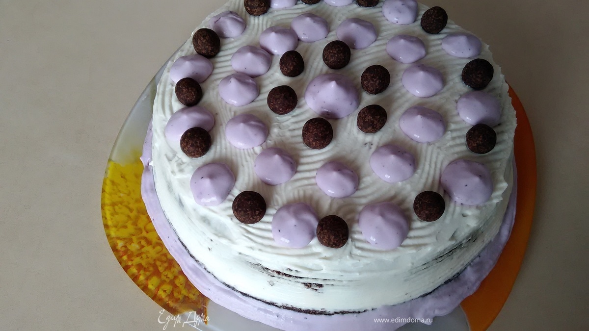 Для украшения я добавила в крем столовую ложку сиропа от черничного варенья. Можно добавить сок черники или даже немного свекольного сока, получается приятный цвет, или готовый краситель.