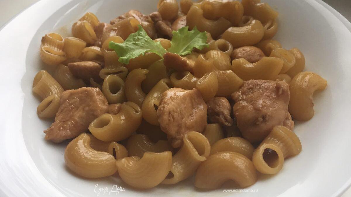 Как только сварились наши макароны, закидываем их к курице и все перемешиваем. Через пару минут после обжаривания блюдо готово к употреблению. Bon apetit!