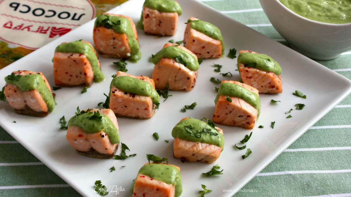 Я предлагаю горячую закуску, но вполне можно приготовить стейки на гриле и подать с этим ароматным соусом. Лосось получается очень нежным, сочным, соус прекрасно дополняет его.