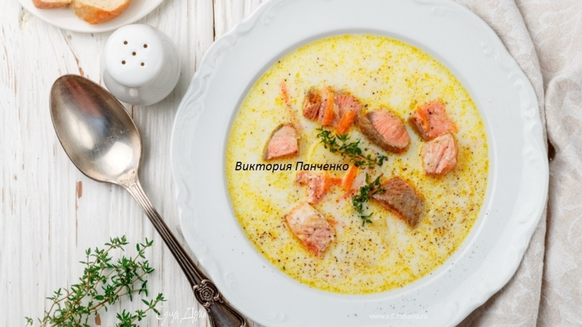 Приправить солью и черным перцем. В сливки ввести муку (1 ст. л. без горки) и хорошо перемешать. Влить смесь в суп и постоянно помешивая довести до кипения. Добавить свежий тимьян для аромата.
